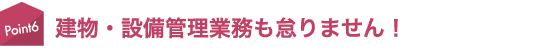 マンションの建物・設備の異常などに伴うトラブルを未然に防ぐために、建物を巡回し、損壊・消耗・老朽化している箇所をチェック。 必要があれば修理します。電球といった消耗品の交換も手掛ける他、室内空気や排水の汚れの定期的な測定を行います。